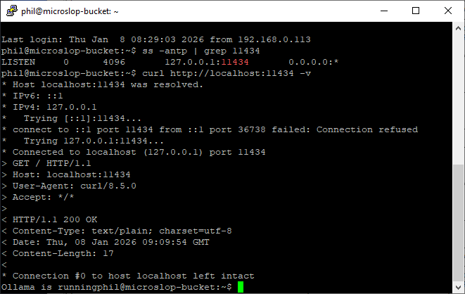 # ss -antp | grep :11434 # curl http://localhost:11434 -v