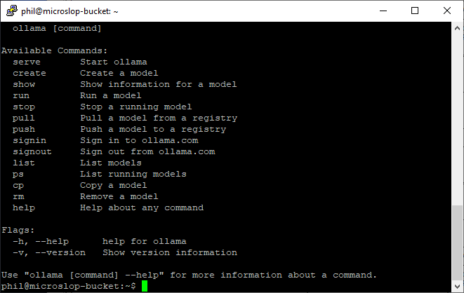 You can list all locally installed models using ollama list, and remove local models by using ollama rm modelname. To run a model from the command line, use ollama run modelname (you can use the –verbose flag here if you want to see stats on load, token generation etc).